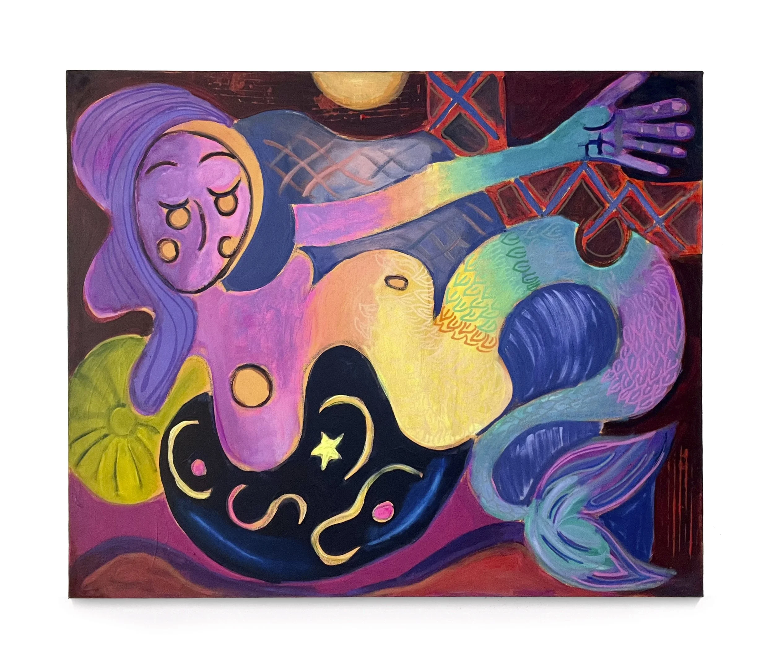 Curated by fellow painters Jared Deery and JJ Manford, Mixed Magic presents an expansive view of Keeshan’s practice, foregrounding the depth of her visual language and conceptual concerns. Their curatorial approach emphasizes the importance of artist-led exhibitions. Mixed Magic presents a cohesive yet expansive view of Keeshan’s work, positioning her within a lineage of artists who engage with painting as an act of psychological excavation, symbolic reconstruction, and intuitive discovery. Whether navigating cosmic dreamscapes, unraveling the syntax of memory, or engaging with abstraction as a mode of expression, Keeshan’s paintings exist in a space of perpetual transformation, where form remains fluid, meaning remains open-ended, and the unknown is always within reach. The eyes, celestial symbols, and hybrid creatures that populate her paintings evoke an esoteric quality, aligning with movements in which artists reclaim spirituality as an intuitive, self-empowering practice.