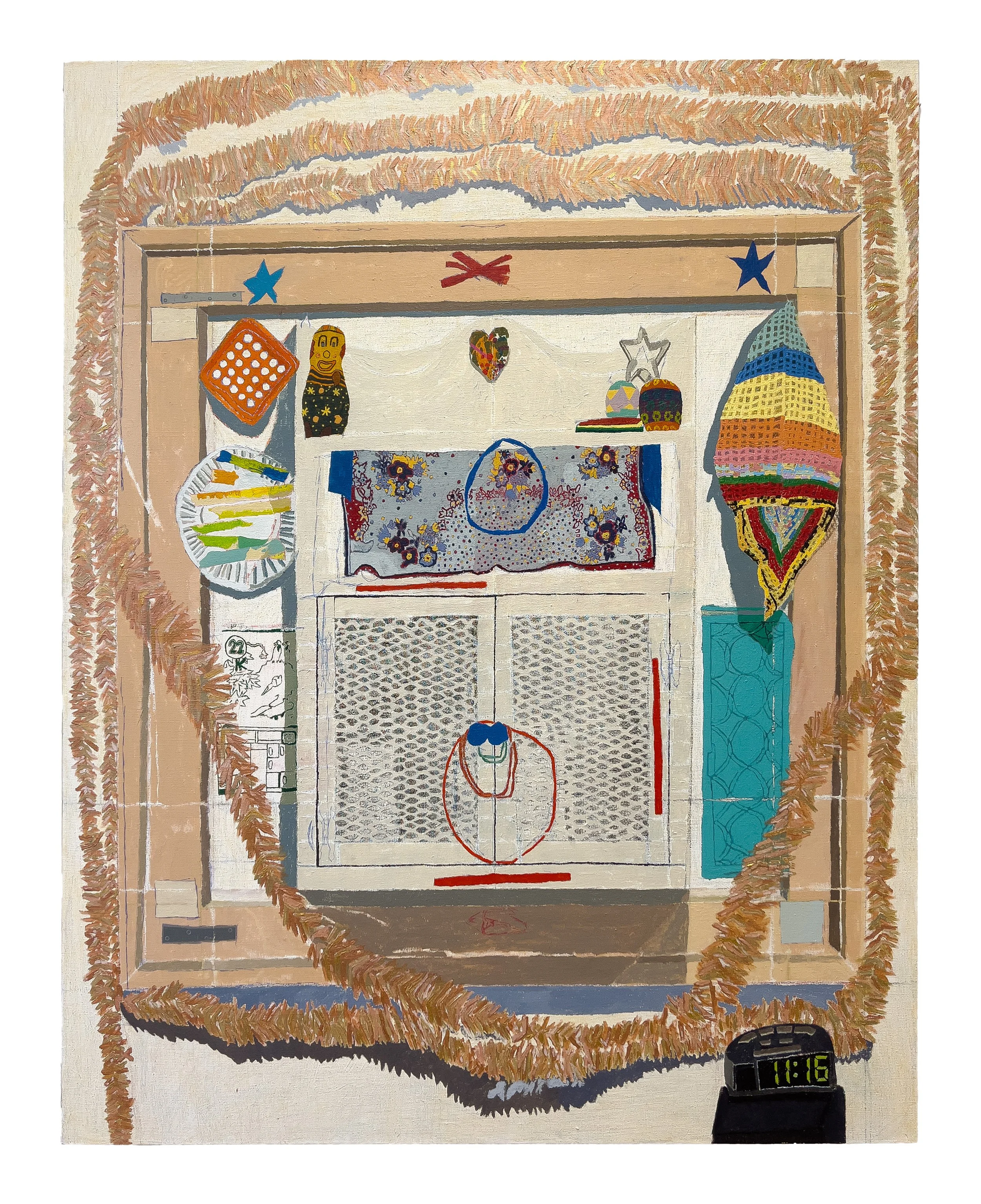 Taking advantage of the increased scale of these recent paintings, Lee has been working more loosely, using larger brushes, and expanding her repertoire of marks and textures with materials including wax crayons and transfer paper. Her use of the latter allows her to work with more precision, standing in pleasant contrast to the more loosely painted passages. Considering painting to be essentially a history of mark making, and with a background in printmaking, Lee intuitively layers both shape and color into idiosyncratic compositions. Space is distorted, tilted, and stretched, showing objects from multiple perspectives. Despite their inherent flatness—with their large planes of color or pattern—some of these new paintings also include representations of windows or mirrors, extending and dividing space in unconventional ways, evident in larger works like Sill Life, 2023, and Solitaire (Day and Night), 2024. This latter work, depicting a view from her studio seen simultaneously at two different times of day, includes items as various as a crocheted textile by Lee’s Chinese grandmother, a green step stool recovered from the street, and a red Easter egg with a bunny on it, leftover from last year’s holiday decorations.